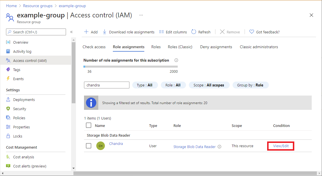 在 Azure 门户中,打开角色分配的 访问控制(IAM) 页,其中包含要查看、编辑或删除的条件。