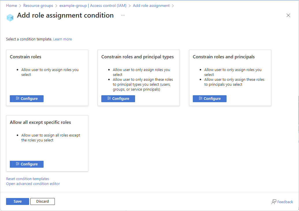 此时会显示 “添加角色分配条件 ”页。 此页将有所不同,具体取决于条件是否与现有模板匹配。