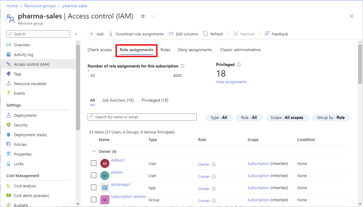 单击“角色分配”选项卡,然后单击“特权”选项卡,列出此范围内的特权管理员角色分配。