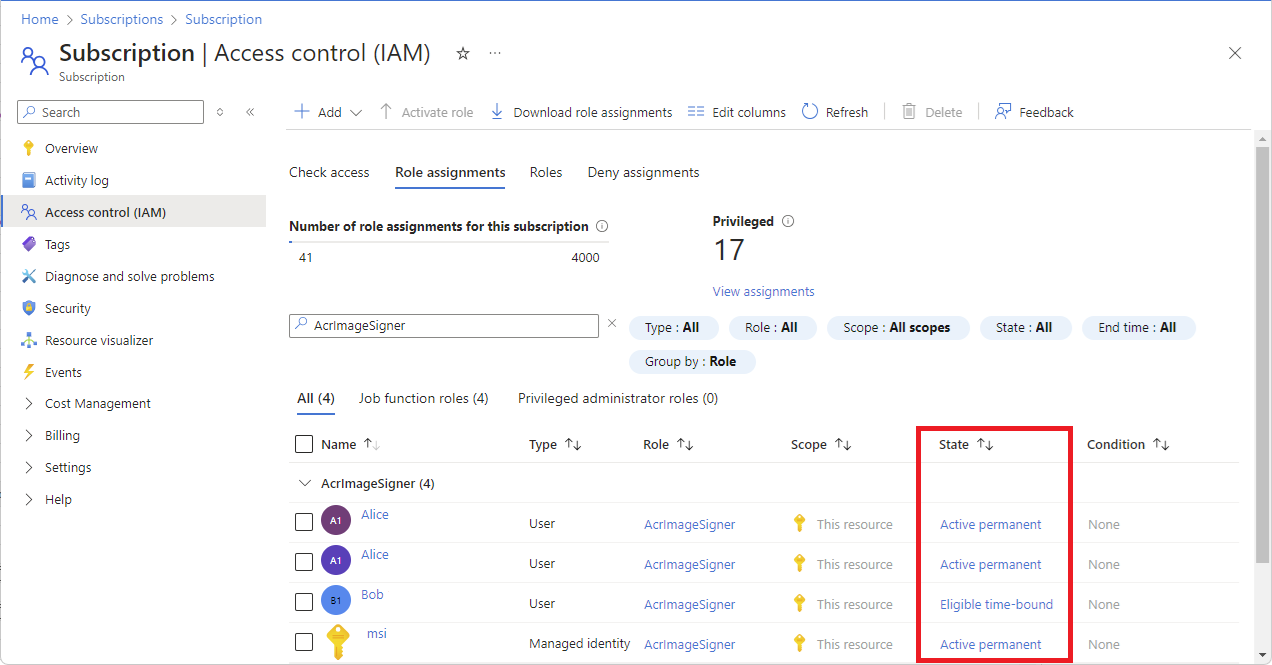 State Description 永久活动 使用户无需执行任何操作,始终可以使用该角色的角色分配。 限时处于活动状态 通过这种角色分配方式,用户无需执行任何操作,只能在开始和结束日期范围内使用角色。 永久符合条件 使用户始终有资格激活该角色的角色分配。 限时符合条件 通过这种角色分配方式,用户只有在开始和结束日期范围内才有资格激活角色。 可以设置将来的开始日期。