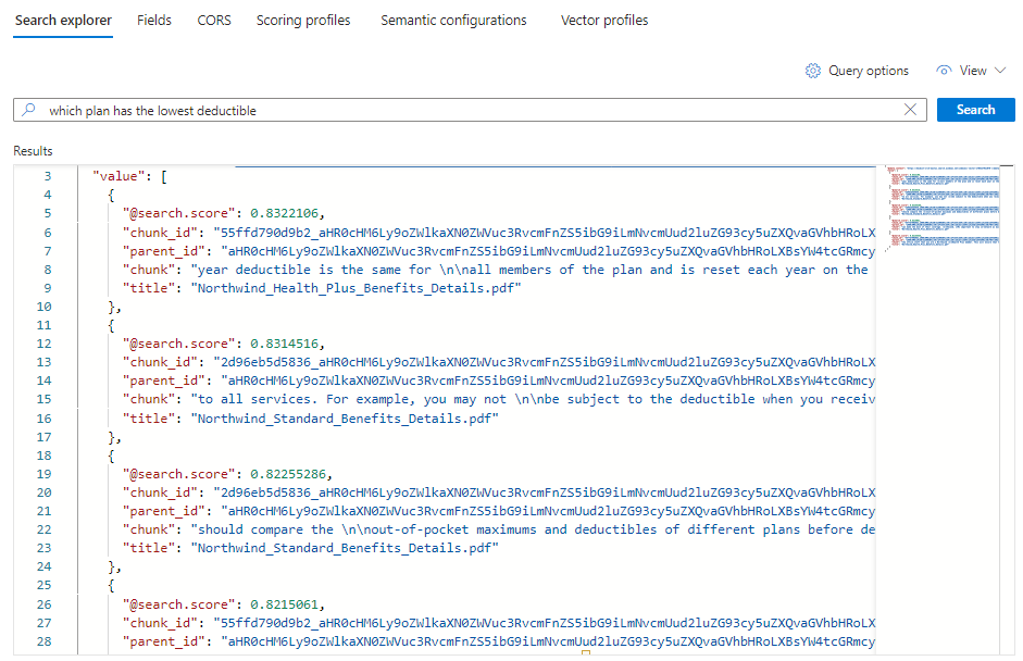 *) 占位符替换为与运行状况计划相关的问题,例如Which plan has the lowest deductible?。{ "search": "Which plan has the lowest deductible?", "count": true, "vectorQueries": [ { "kind": "text", "text": "Which plan has the lowest deductible?", "fields": "text_vector,image_vector" } ], "queryType": "semantic", "semanticConfiguration": "my-demo-semantic-configuration", "captions": "extractive", "answers": "extractive|count-3", "queryLanguage": "en-us", "select": "chunk_id,text_parent_id,chunk,title" }若要运行查询,请选择“ 搜索”。