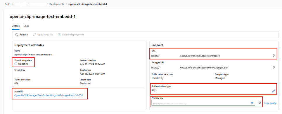 通过监视“预配状态”,等待模型完成部署。 该状态应从“正在预配”更改为“正在更新”,再更改为“成功”。 可能需要每隔几分钟选择“刷新”才能查看状态更新。