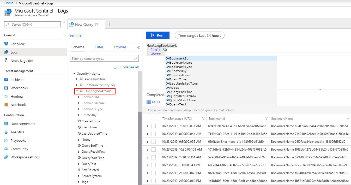 直接在 Log Analytics 工作区中的 HuntingBookmark 表中查看已加入书签的数据。 例如: