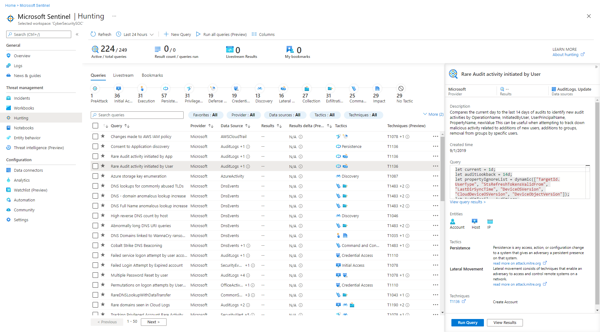 使用“查询”选项卡,通过查看结果计数、峰值或 24 小时内结果计数的变化,确定开始搜寻的位置。 按收藏夹、数据源、MITRE ATT&CK 策略或方法、结果、结果差异或结果差异百分比进行排序和筛选。 查看仍需要连接数据源的查询,并获取有关启用此类查询的建议。