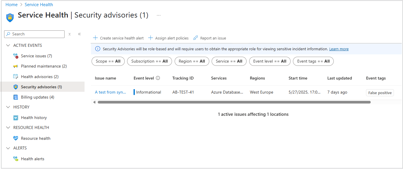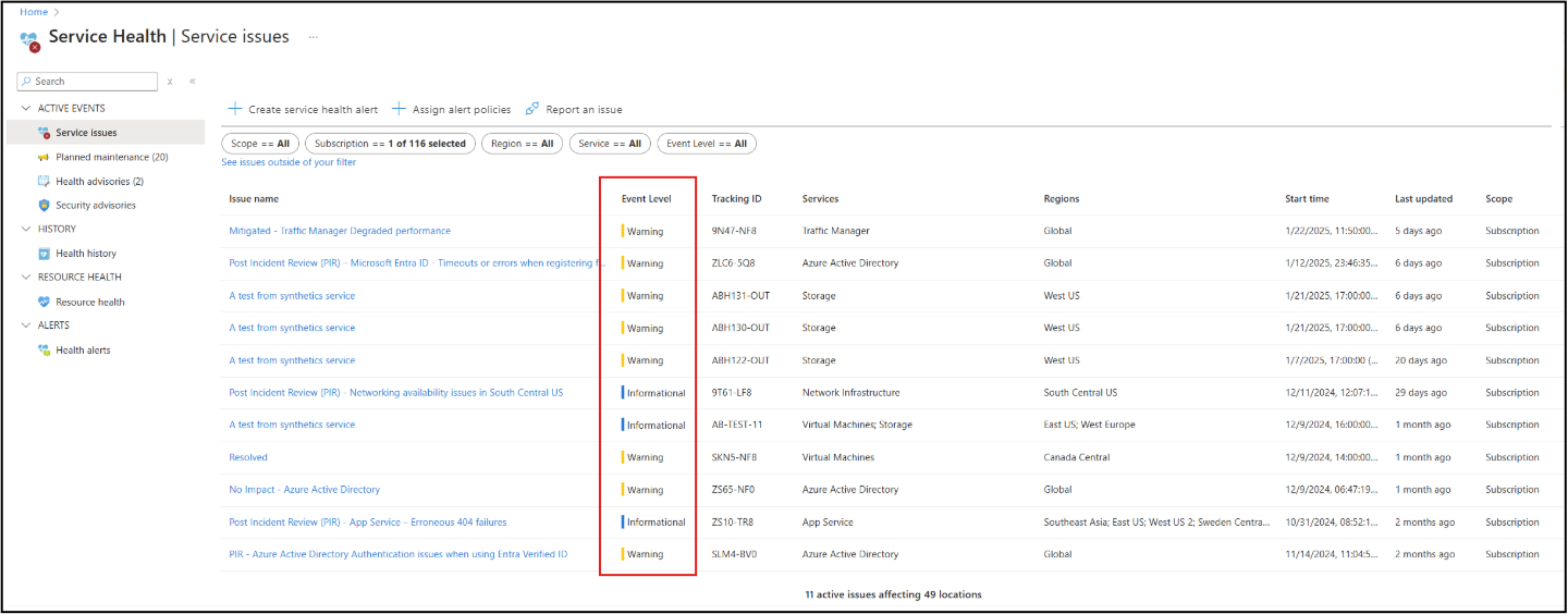 为了帮助你确定 Azure 服务运行状况事件通信的优先级, 服务问题、运行状况公告 和安全 公告 窗格包括名为 “事件级别”的新元数据字段。 此字段可帮助你了解每个通信的重要性,并快速评估每个警报的重要性。