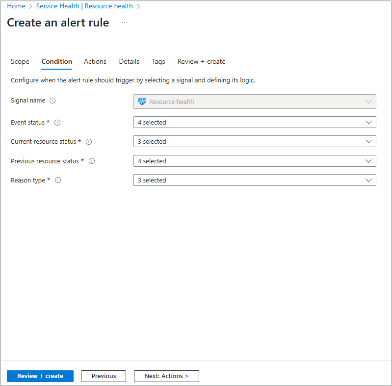 - 按照以下步骤,从条件选项卡开始,在警报规则向导中创建资源健康警报。