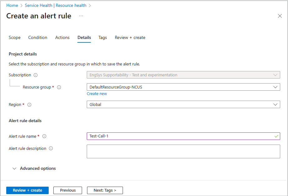 范围定义警报监视的资源。 在此选项卡中,选择对业务而言最重要的订阅、资源组或单个资源。 此信息是必需的,因为资源运行状况警报仅针对范围中包含的资源触发。
