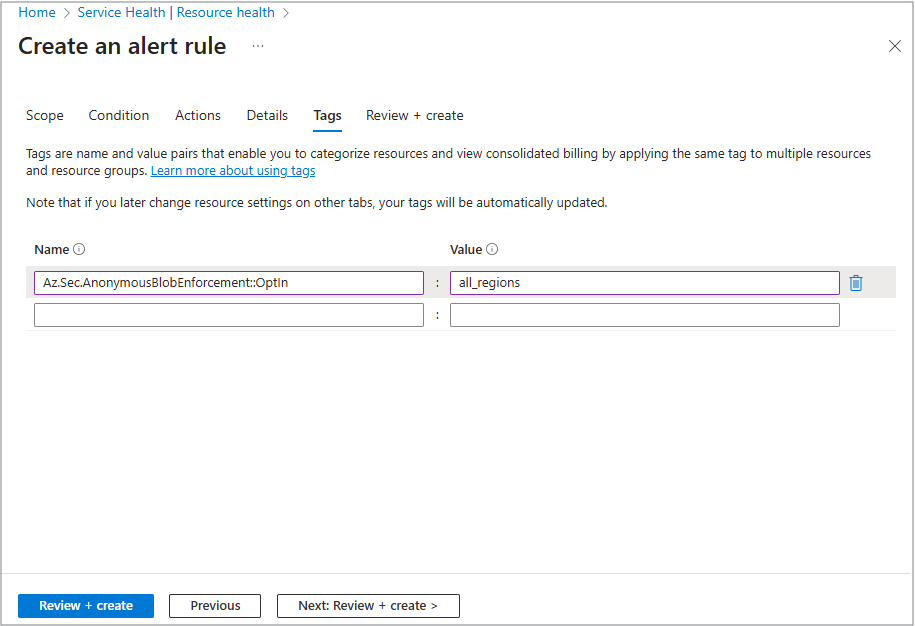 若要设置警报,请使用此窗口中的六个选项卡: 范围、 条件、 作、 详细信息、 标记和 查看 + 创建。