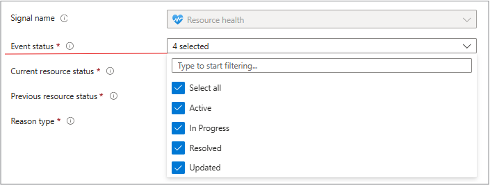 “信号名称”字段会自动填充并显示触发警报的事件类型。 对于资源运行状况警报,通常是 资源运行状况。 它告知 Azure 要监视的信号,以便在资源运行状况发生更改时触发警报。 在此选项卡中,您可以从您希望用于警报的健康相关条件中进行选择,例如: