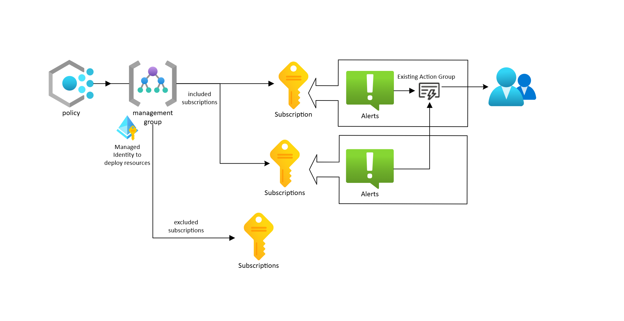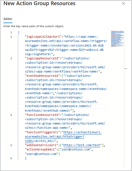 输入管理组或订阅中现有操作组的资源 ID(根据策略的范围),该资源 ID 应用于发送警报。 此操作组可用于在不同订阅之间发送警报。