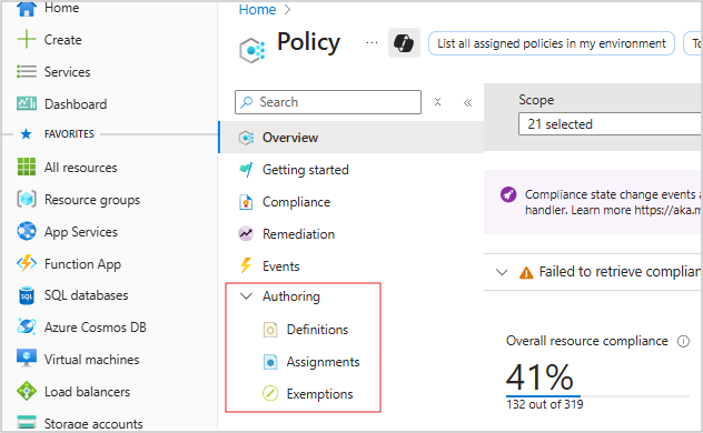 AuditIfNotExists:策略报告符合性,但不创建任何资源。 它会检查是否存在以下特定的警报规则: