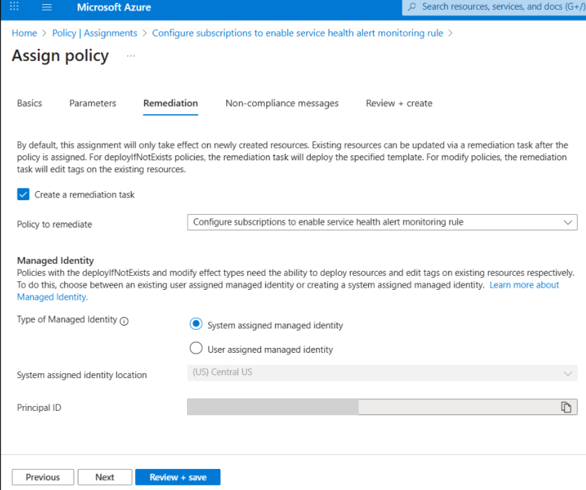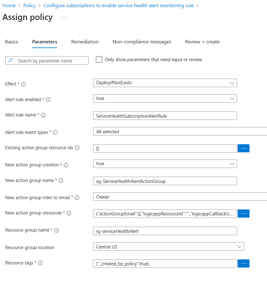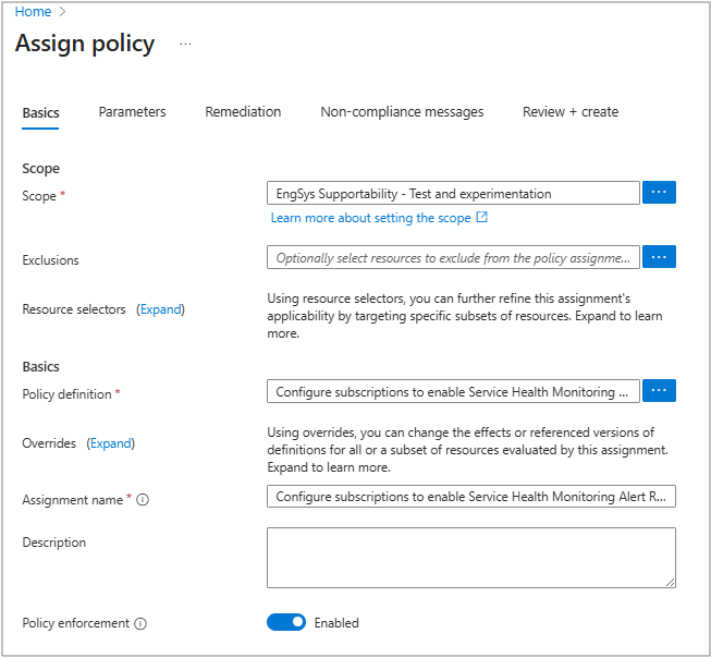 - 确保策略定义包含 配置订阅以启用服务运行状况监视警报 规则。 还可以根据需要更新分配名称和说明。