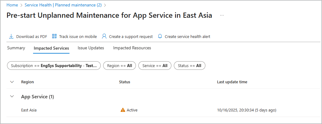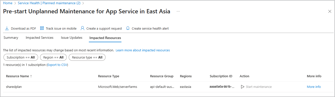 打开“计划内维护”窗格时,会看到与订阅相关的维护事件列表。