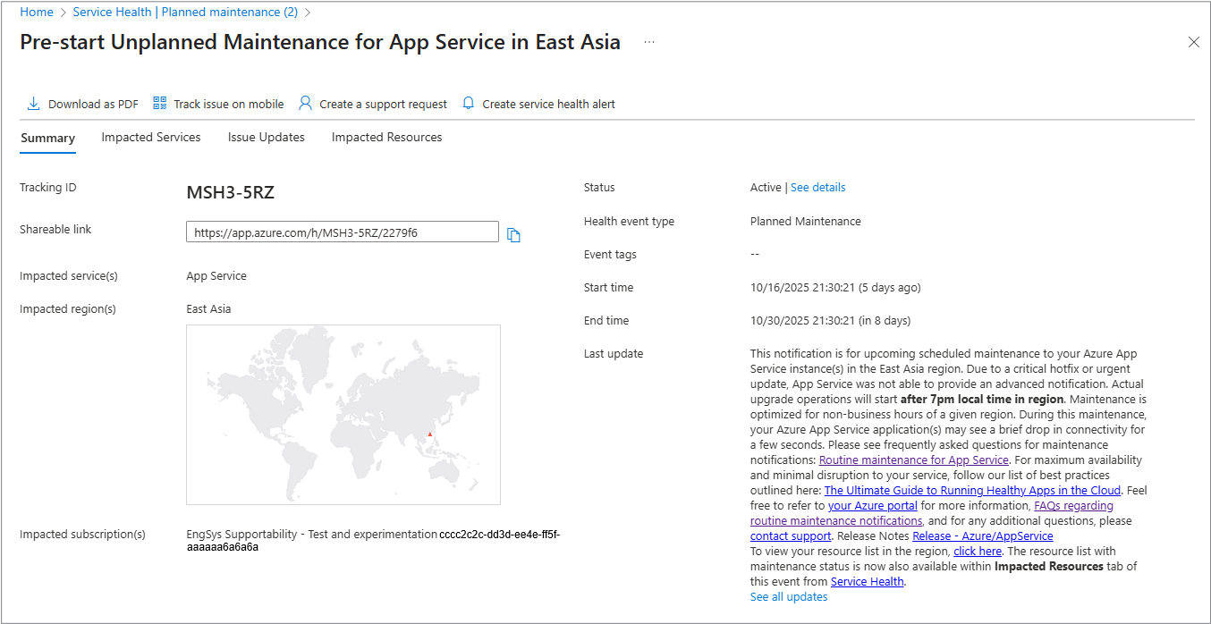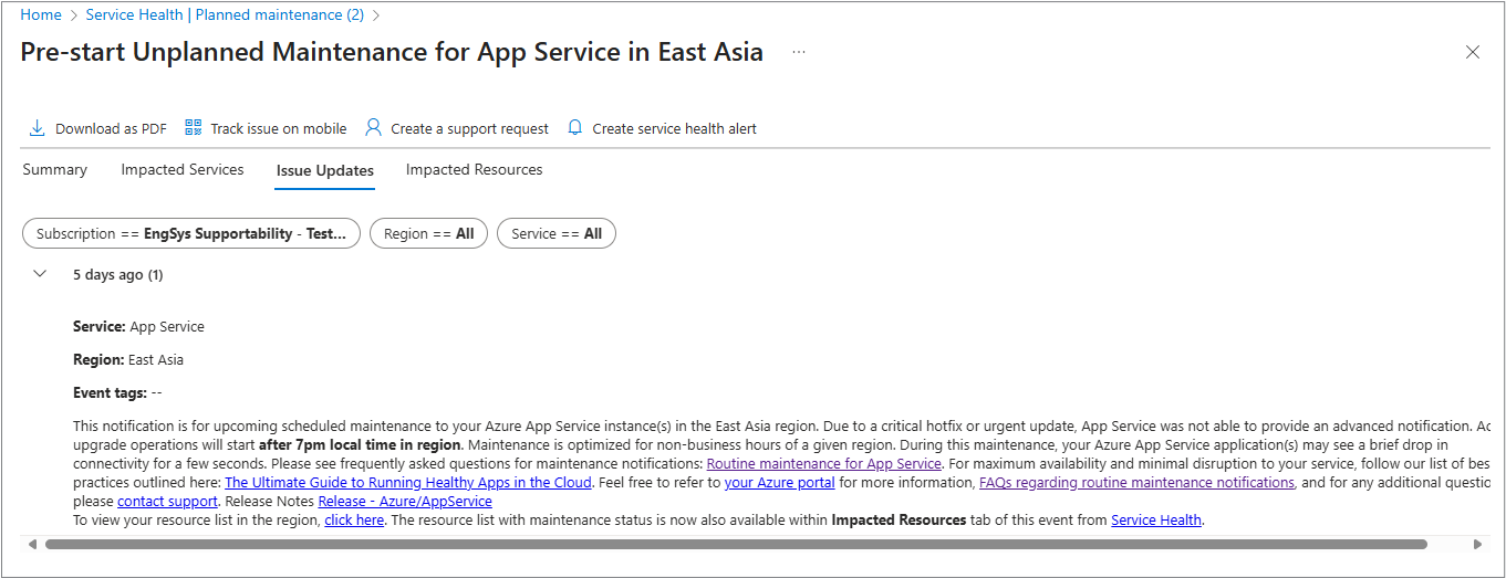 - 计划维护时段:如果未启动,Azure 服务运行状况会自动应用更新。