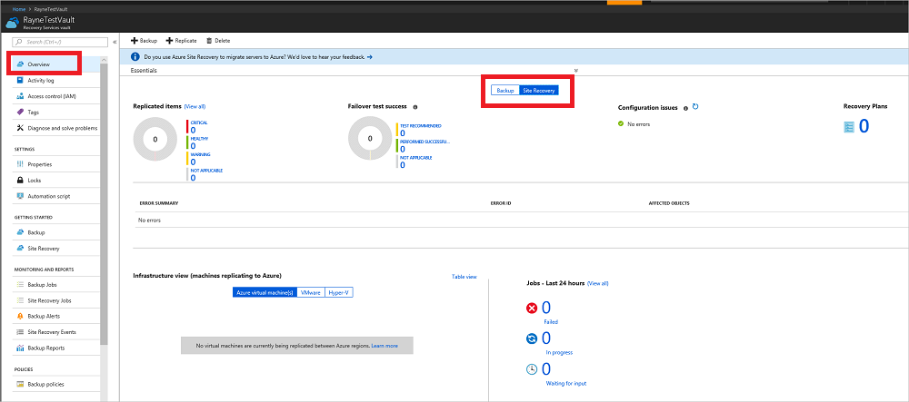 在保管库中,选择“概述”。 恢复服务仪表板在单个位置合并了保管库的所有监视信息。 Site Recovery 和 Azure 备份服务都有页面,可在这些页面之间切换。