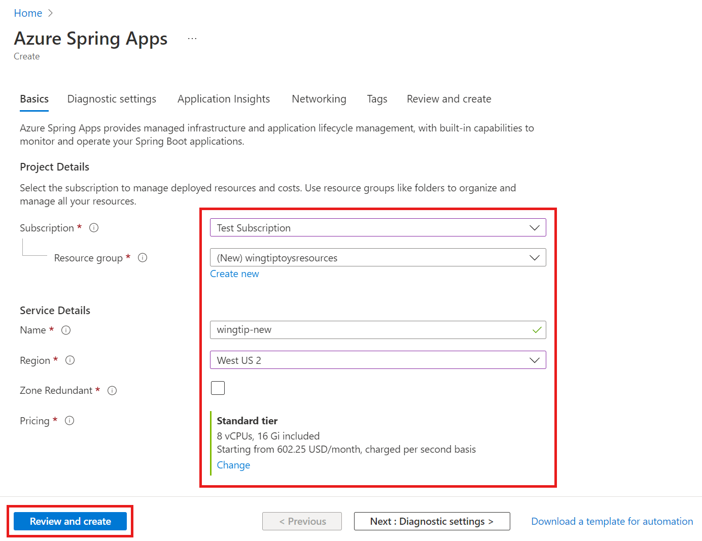 在 Azure Spring Apps 的“创建”页中填写表单。 遵循以下指南: