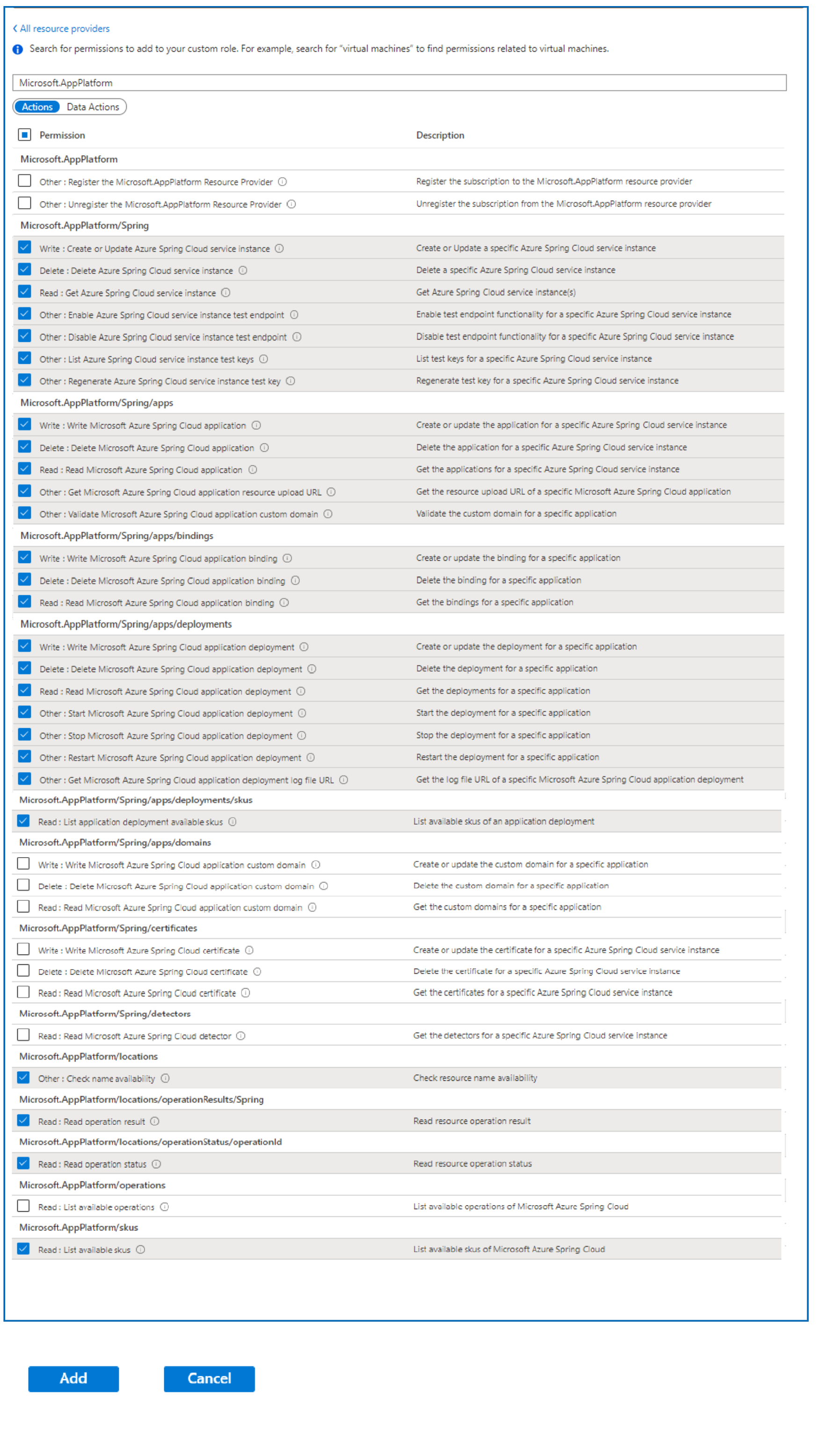 在“Microsoft.AppPlatform/Spring”下,选择: