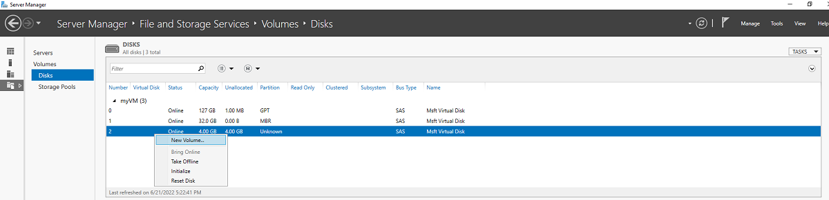 仍在 Windows Server 2019 Datacenter VM 中,选择“文件和存储服务”>“卷”>“磁盘”。