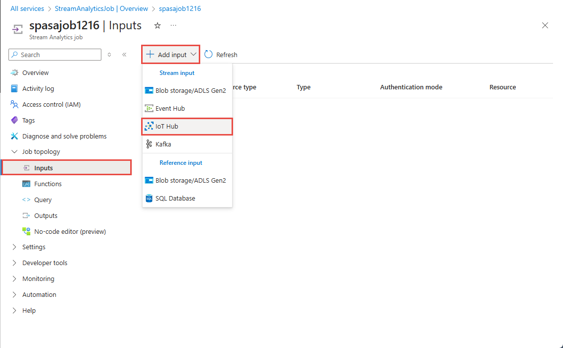 在“流分析作业”页面上,选择左侧菜单上“作业拓扑”下的“输入”。
