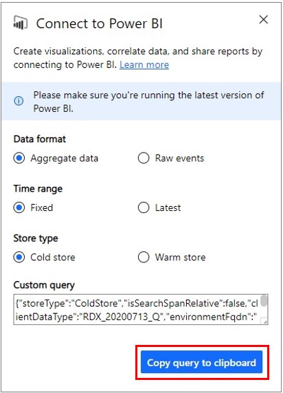 时间范围:选择要在 Power BI 中查看“固定”时间范围数据还是“最新”时间范围数据 。 选择固定时间范围意味着你所绘制的搜索范围内的数据将导出到 Power BI。 选择最新时间范围意味着 Power BI 将获取所选搜索范围内的最新数据(例如,如果你绘制任意 1 小时的数据并选择“最新”设置,则 Power BI 连接器将始终查询最新 1 小时的数据。)