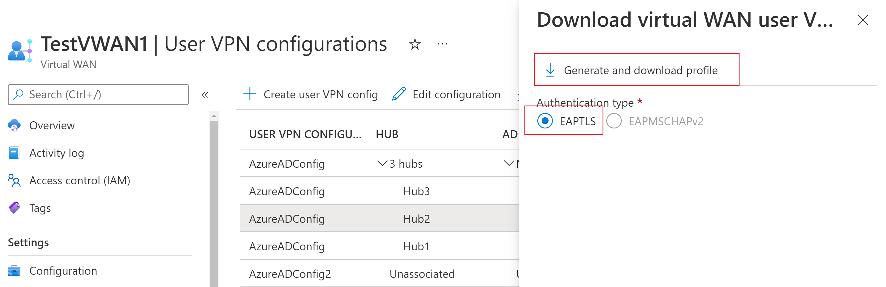 在“下载虚拟 WAN 用户 VPN”页面上,选择“EAPTLS”,然后单击“生成并下载配置文件”。 系统将生成包含 VPN 客户端配置设置的配置文件包(zip 文件),并将其下载到计算机。 包的内容取决于适用于所选配置的中心以及身份验证和隧道类型选项。