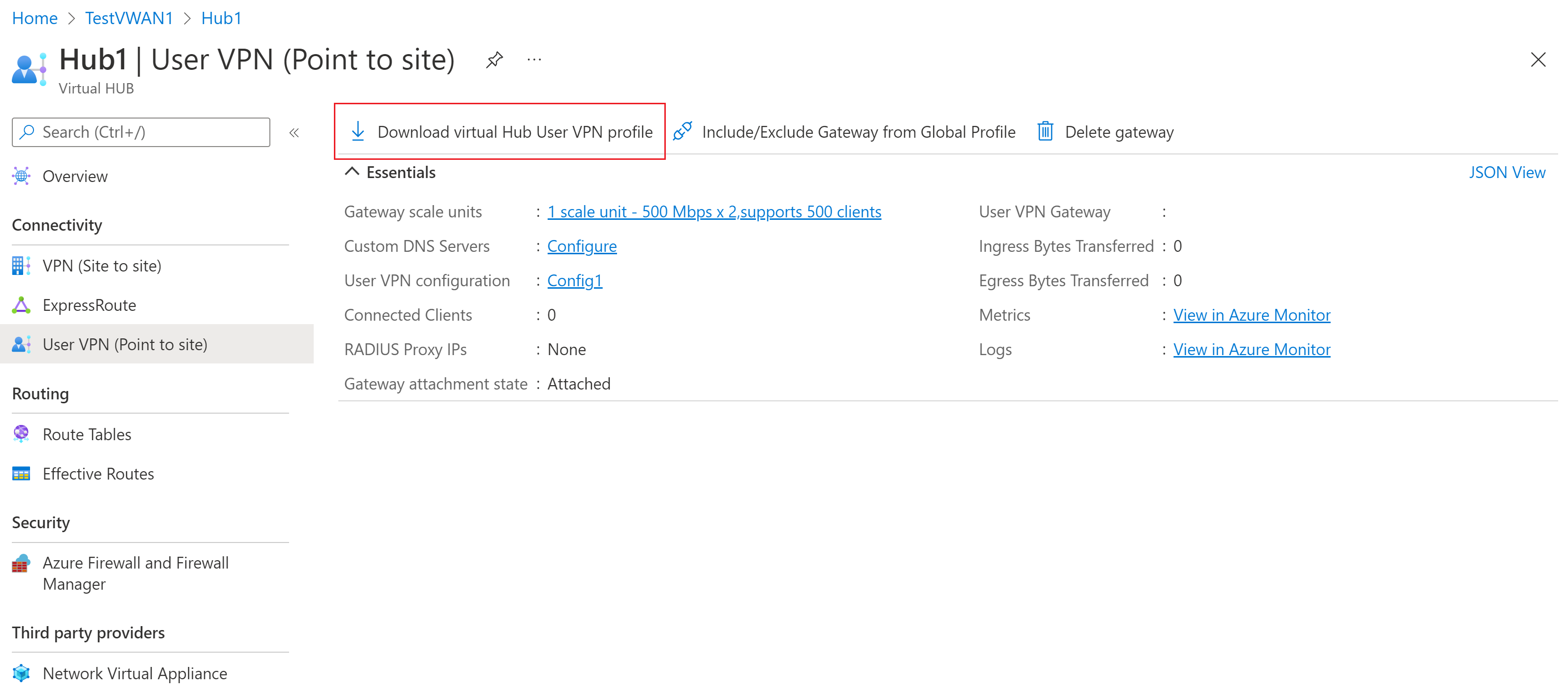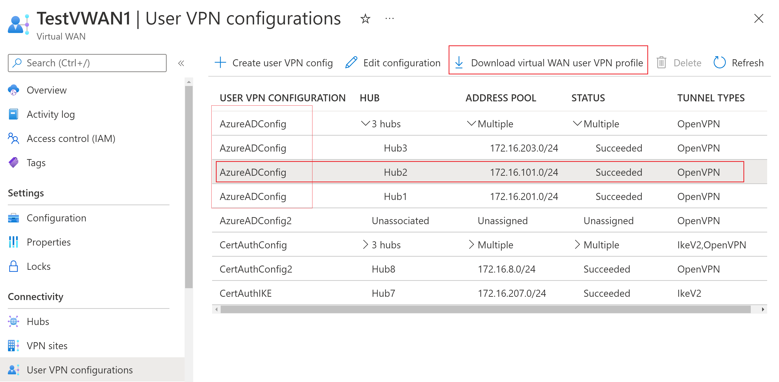 单击包含要使用的用户 VPN 配置的行。 这会突出显示整个行。 然后,单击“下载虚拟 WAN 用户 VPN 配置文件”。