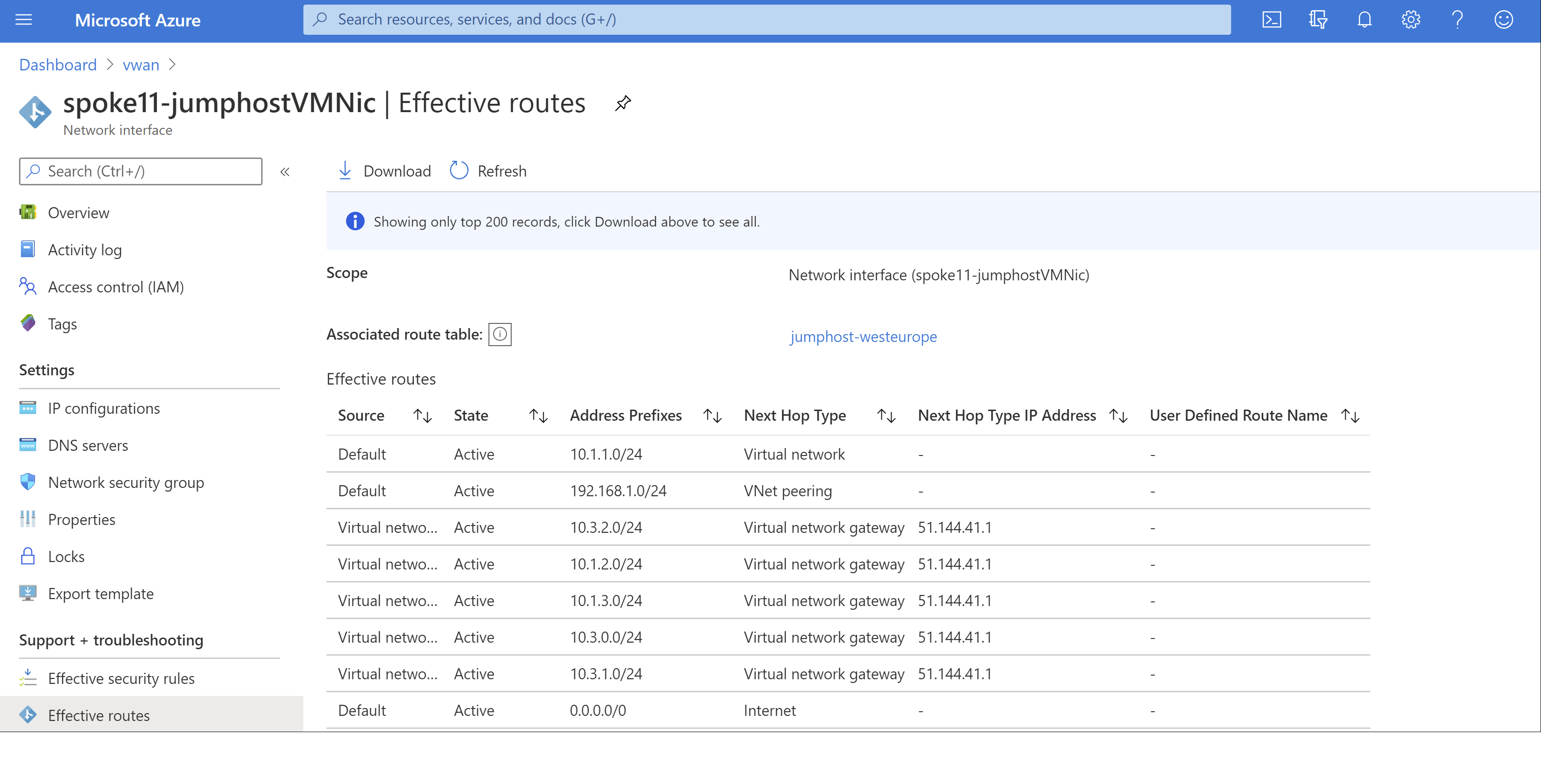 为了再次检查此 VNet (10.1.1.0/24) 是否已连接到配置了专用终结点的原始 VNet (10.1.3.0/24),可以验证 VNet 中任何虚拟机中的有效路由表: