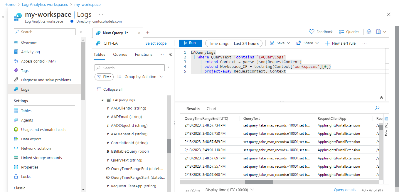 LAQueryLogs | where QueryText !contains 'LAQueryLogs' | extend Context = parse_json(RequestContext) | extend Workspace_CF = tostring(Context['workspaces'][0]) | project-away RequestContext, Context