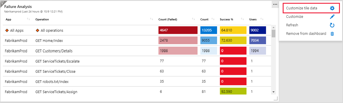 默认情况下,仪表板磁贴上的时间跨度/时间范围设置为 24 小时。若要更改,请单击右上角的省略号,选择“自定义磁贴数据”,检查“在标题级别替代仪表板时间设置”框,然后使用下拉菜单选择时间跨度。