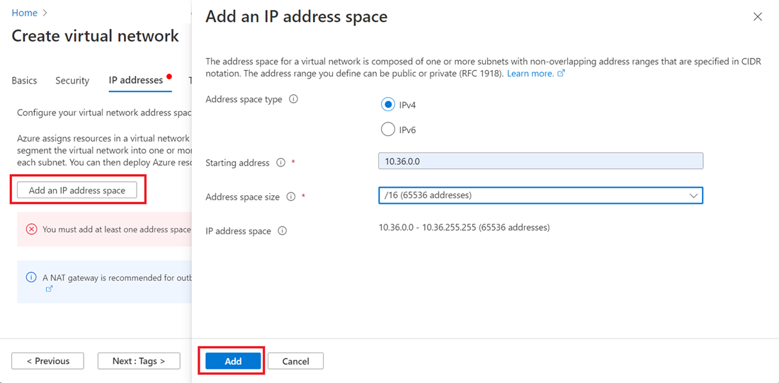 Select Add an IP address space to open the pane to create the address space that you need. This tutorial uses the address space of the remote region: 10.36.0.0/16. Select Add.