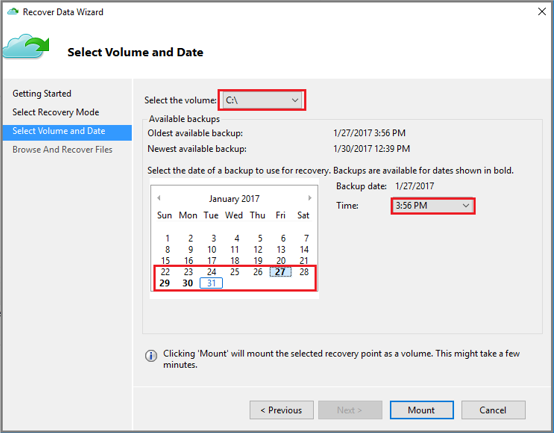 在“选择卷和日期”页上,选择包含想要还原的文件或文件夹的卷,然后选择“装载” 。 选择日期,然后从下拉菜单中选择与恢复点相对应的时间。 以粗体显示的日期指示当天至少有一个可用的恢复点。