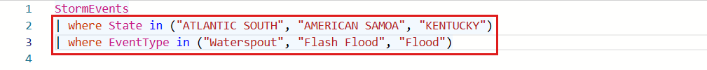StormEvents | take 10选择包含你要为其创建查询筛选器的内容的单元格。 若要选择多个单元格,请单击鼠标并拖动到你要选择的单元格上,或者在按住“Ctrl”键的同时单击每个单元格。 例如,从