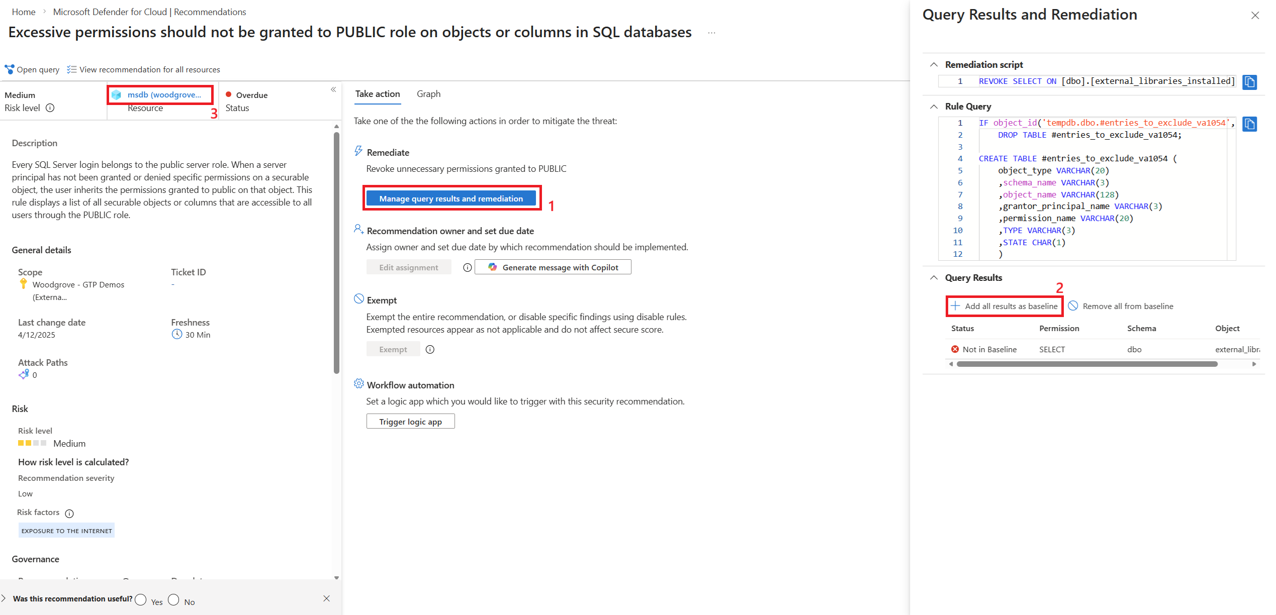 3. 选择“ 管理查询结果和修正 ”以查看用于评估建议的查询、生成修正脚本或设置基线。