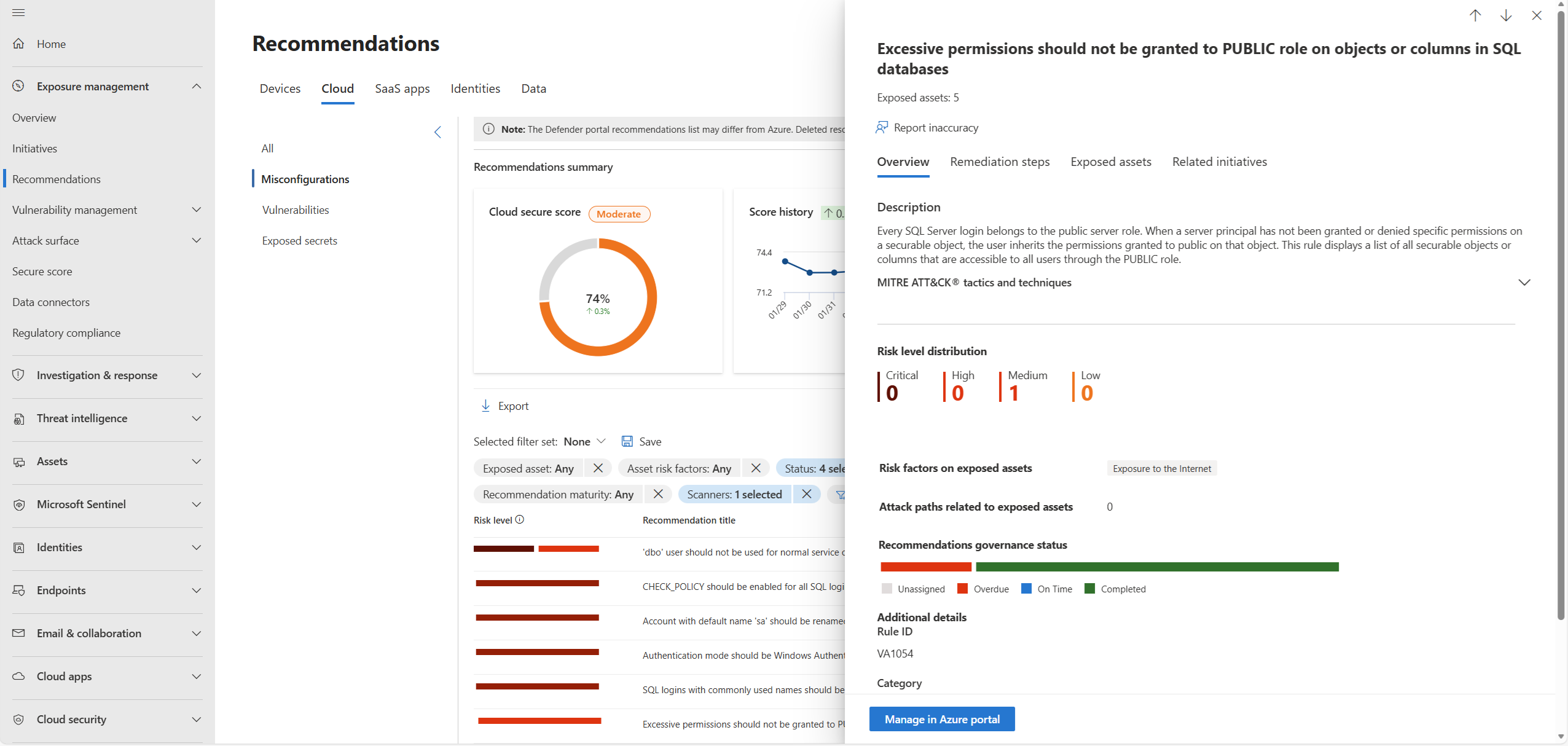 Defender 门户建议页的屏幕截图,其中显示了云 > 配置错误,并筛选扫描程序到 SQL 漏洞评估。