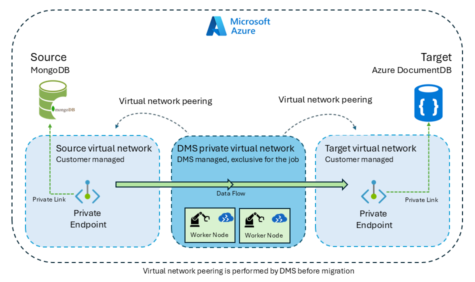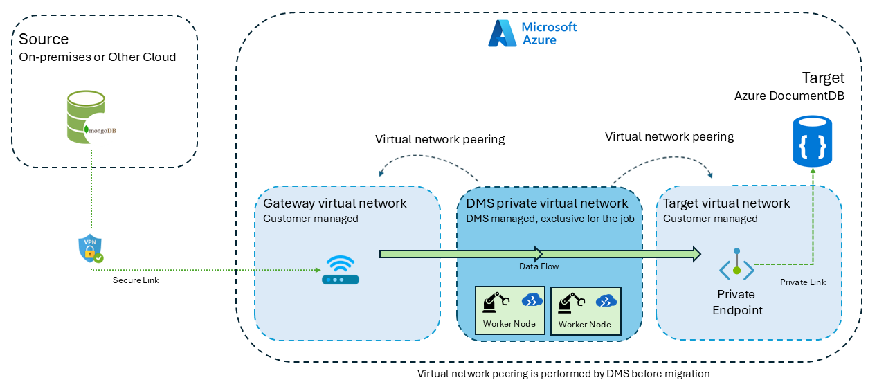 在专用连接中,迁移作业在其虚拟网络内运行。 为了安全地与虚拟网络通信,我们使用虚拟网络对等互连。 有关网络模型的详细信息,请参阅 专用连接。