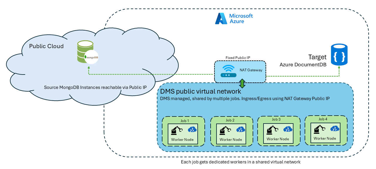 在公共连接模式下,Azure Database Migration Service(DMS)通过公共 Internet 连接到源服务器和目标服务器。 DMS 提供的静态 IP 地址可添加到源服务器和目标服务器上的防火墙允许列表。 DMS 将共享公共虚拟网络用于给定区域中的所有迁移。 虽然此虚拟网络在客户之间共享,但每个迁移作业在其自己的独立专用工作节点上运行,以确保作业级别的隔离。