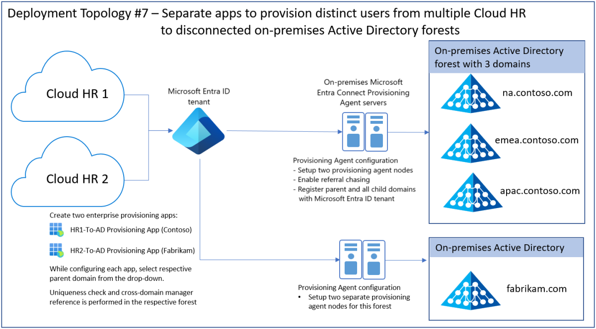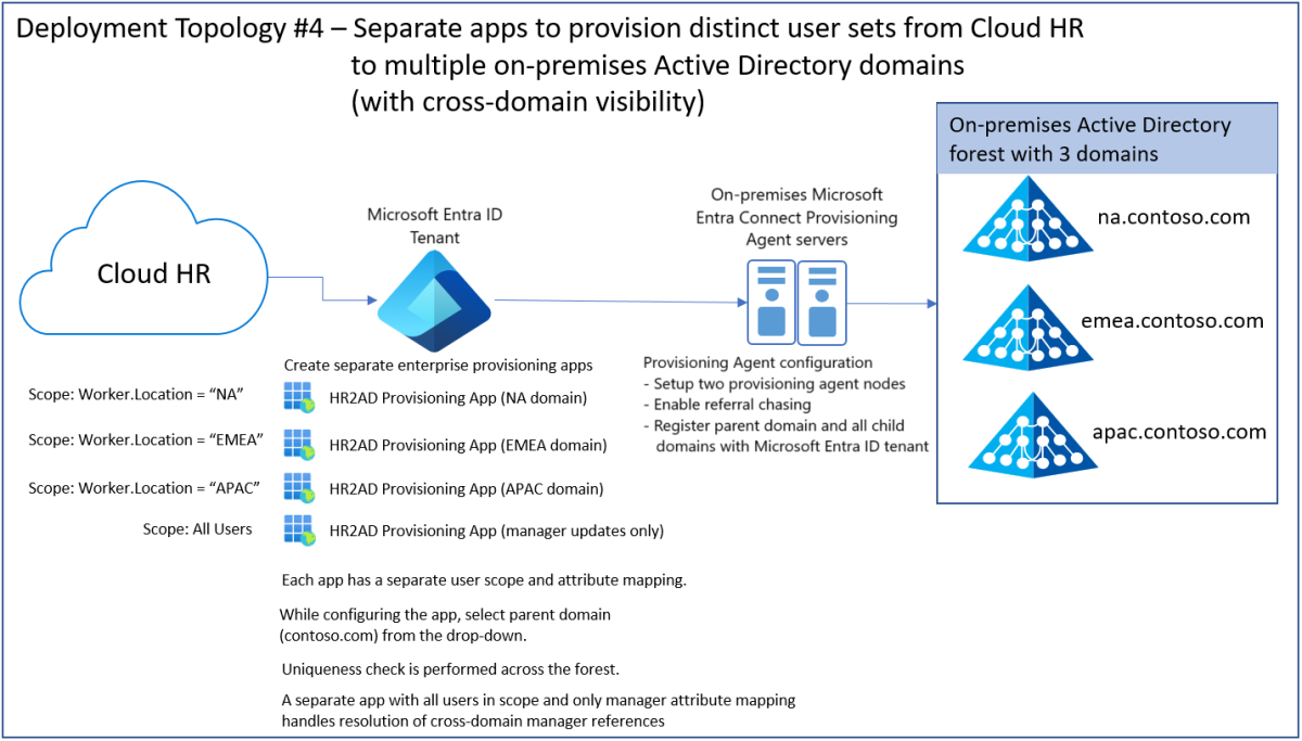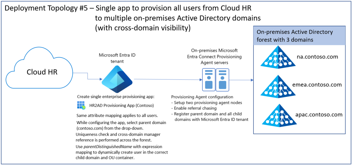 - 单一云 HR 应用租户 -> 以不相邻 Active Directory 林中的多个子域为目标