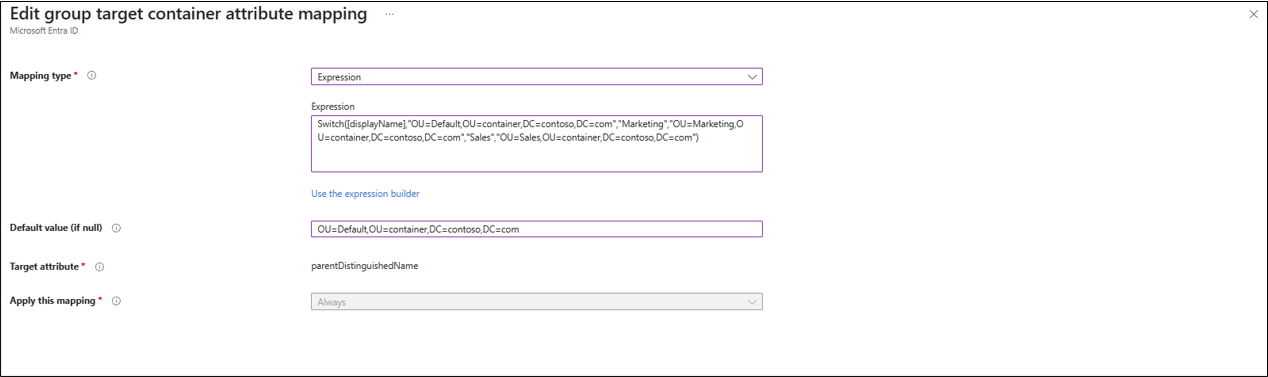 可以使用具有 Switch() 函数的属性映射表达式来配置多个目标容器。 使用此表达式时,如果 displayName 值为 Marketing 或 Sales,则会在相应的 OU 中创建该组。 如果没有匹配项,则会在默认 OU 中创建该组。