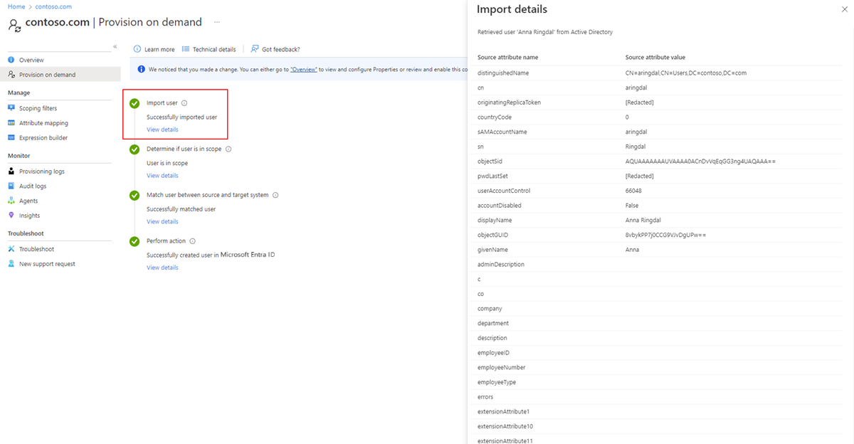 通过使用此信息,可以看到导入的各种属性(及其值)。 如果创建了自定义属性映射,可在此处查看该值。