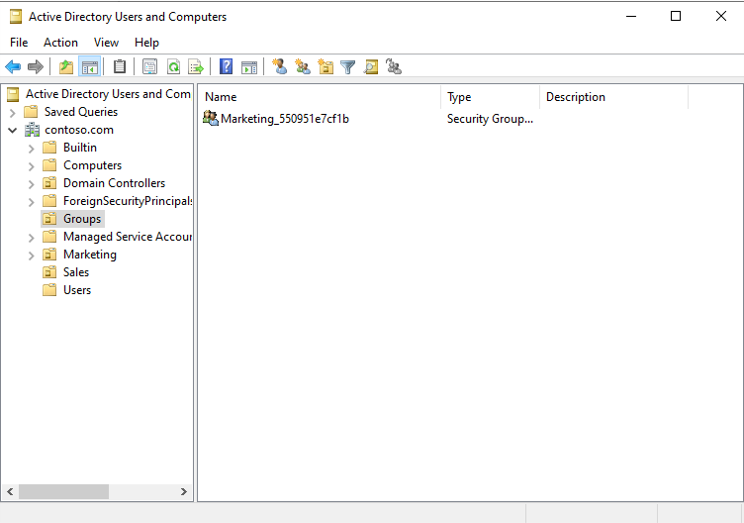 7. 在 Active Directory 中,应该会看到新创建的 Marketing 组。 在 Active Directory 用户和计算机中创建的新组的截图。