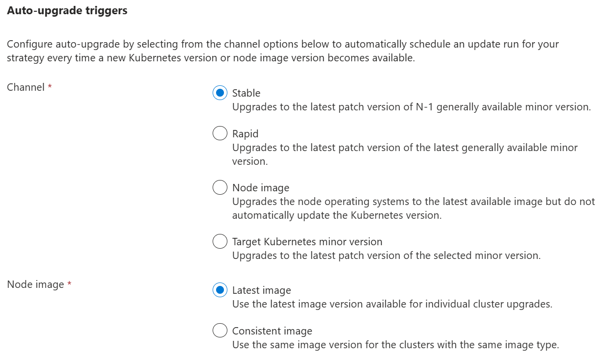 - 一致的映像:自动升级可以在多个 Azure 区域中使用 AKS 群集,其中最新的可用节点映像可能不同(有关详细信息,请查看 AKS 发布跟踪器 )。 选择此选项可确保自动升级配置文件在所有 Azure 区域中选取最新的通用映像,以实现一致性。