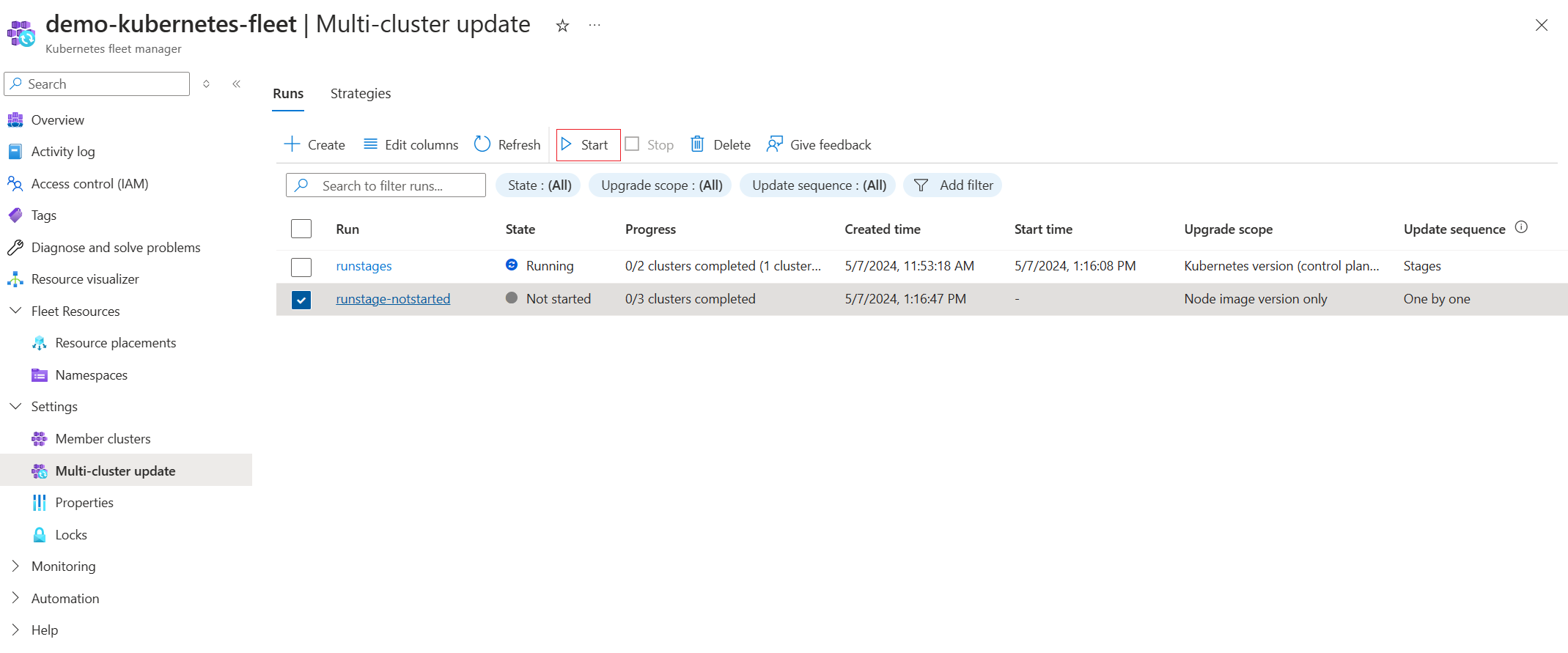 在舰队资源的“多群集更新”页上,可以启动处于“未启动”或“失败”状态的更新运行: