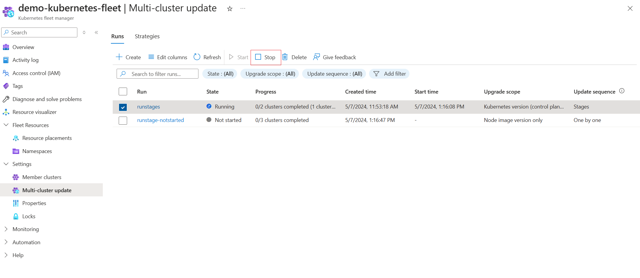 可以使用 命令停止当前正在运行的更新运行az fleet updaterun stop: