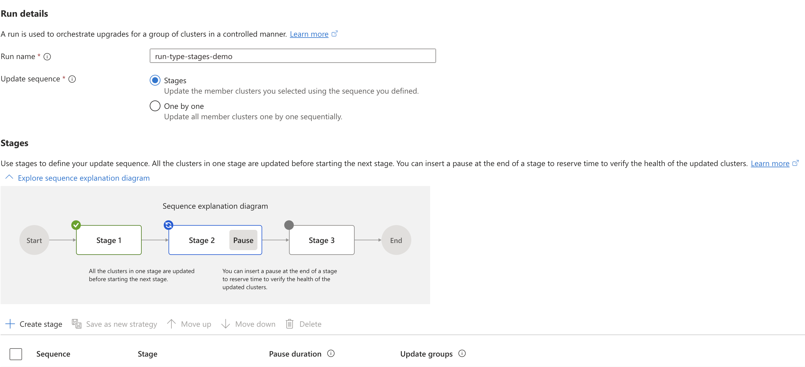 输入更新运行的名称,然后选择“阶段”作为更新顺序类型。