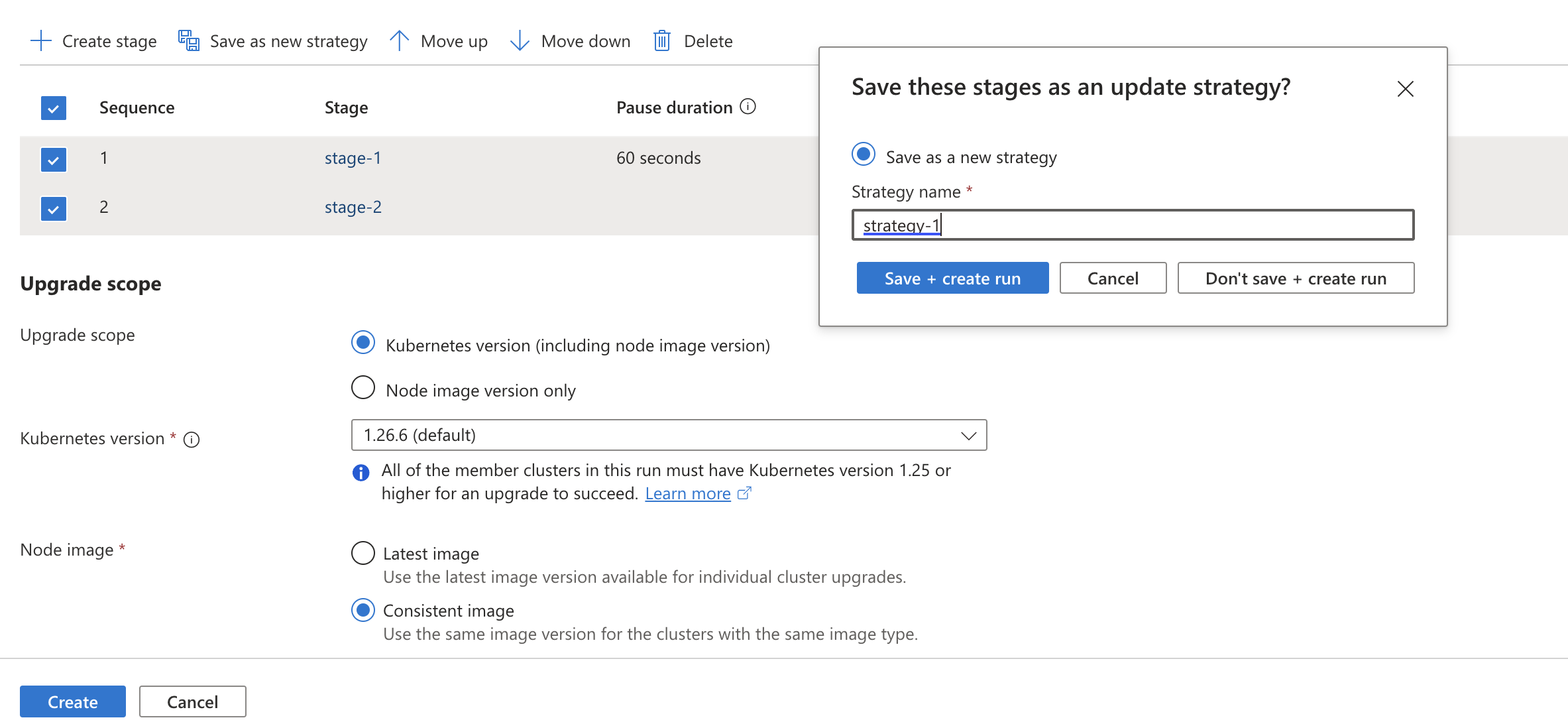 使用 az fleet updaterun create 命令创建更新运行,其中 --stages 标志设置为 JSON 文件的名称,--upgrade-type 和 --node-image-selection 标志设置为所选值。 以下命令会创建一个更新运行,该运行用于更新控制平面和节点池的 Kubernetes 版本,并使用其区域中每个群集可用的最新节点映像。