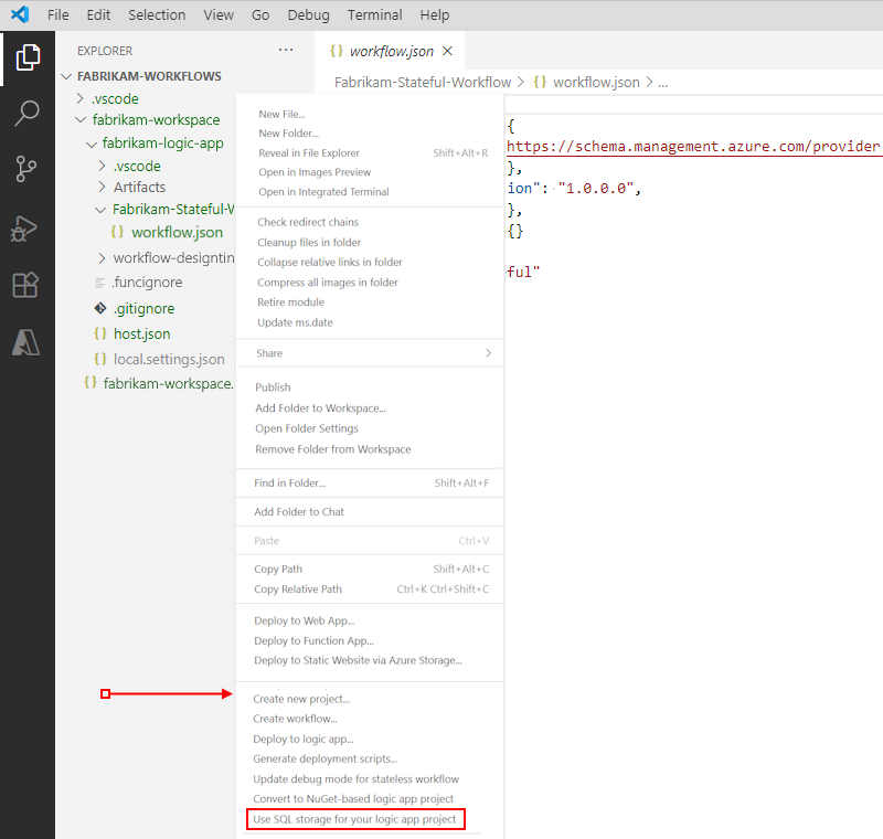 在资源管理器窗格中,在逻辑应用项目的根目录中,将鼠标指针移到项目文件和文件夹下的任何空白区域上,打开快捷菜单,然后选择 “为逻辑应用项目使用 SQL 存储”。