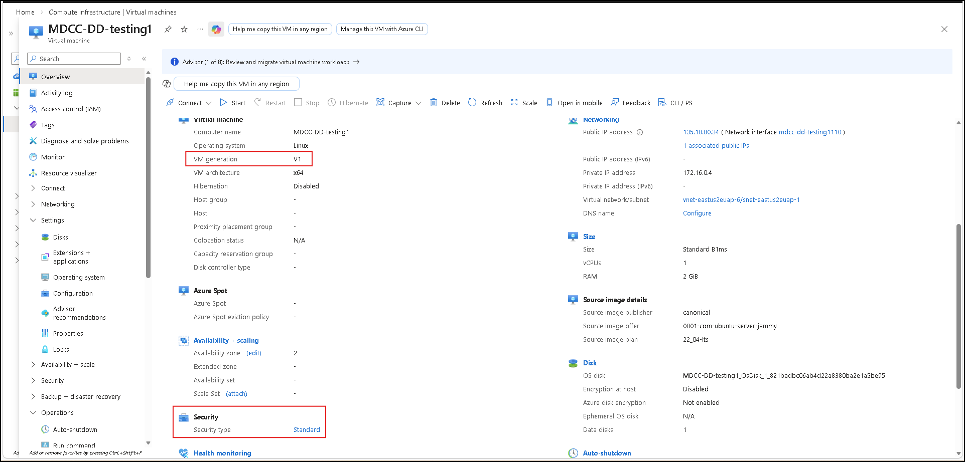 更新成功完成后,关闭“配置”页。 在 VM 属性中的“概述”页上确认“安全类型”设置。