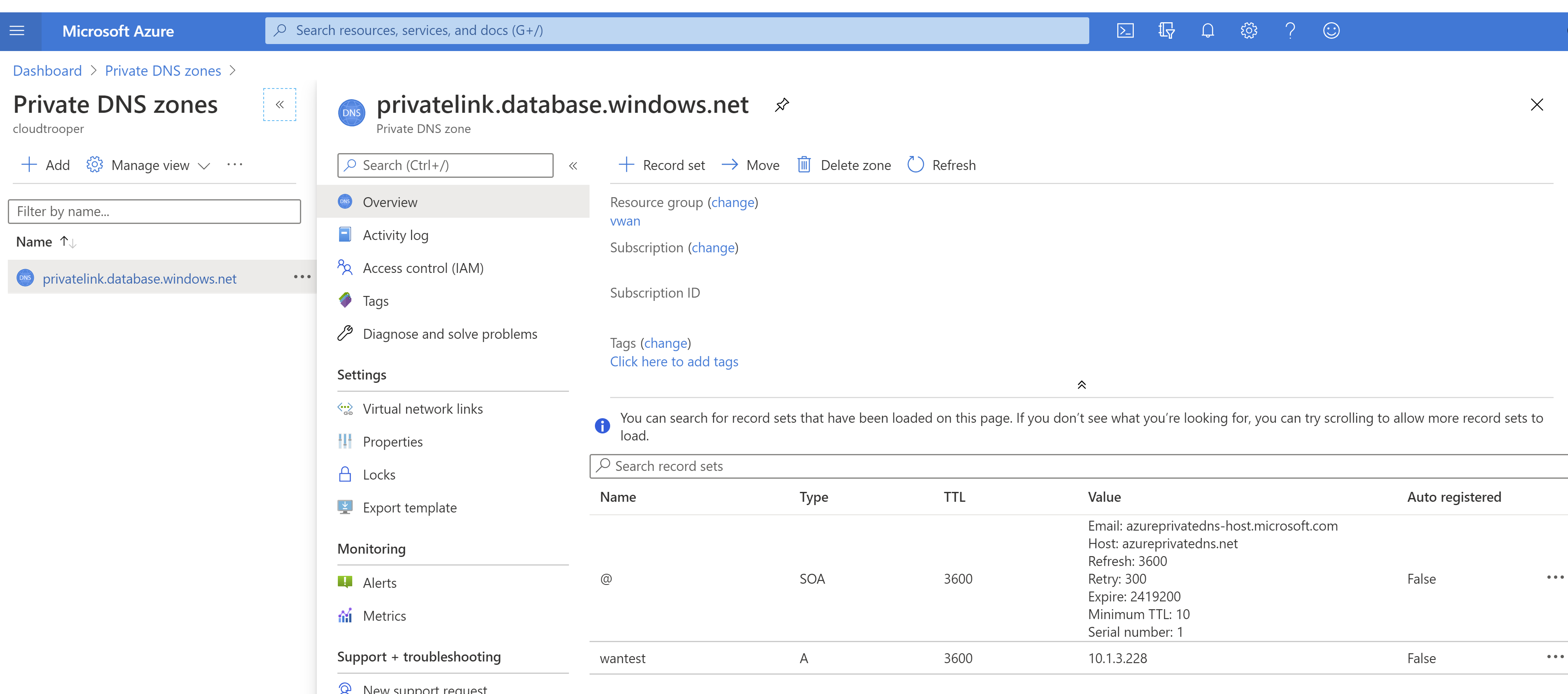 如您在上一输出中所见,FQDN wantest.database.chinacloudapi.cn 映射到 wantest.privatelink.database.chinacloudapi.cn,与专用终结点一起创建的专用 DNS 区域解析为专用 IP 地址 10.1.3.228。 查看专用 DNS 区域,以确认专用终结点映射到专用 IP 地址的 A 记录是否存在: