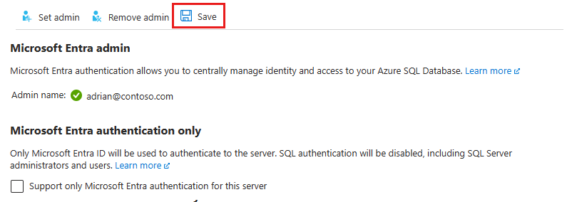要删除管理员,请在“Microsoft Entra ID”页面顶部,选择“移除管理员”,然后选择“保存”。 移除 Microsoft Entra 管理员会禁用逻辑服务器的 Microsoft Entra 身份验证。