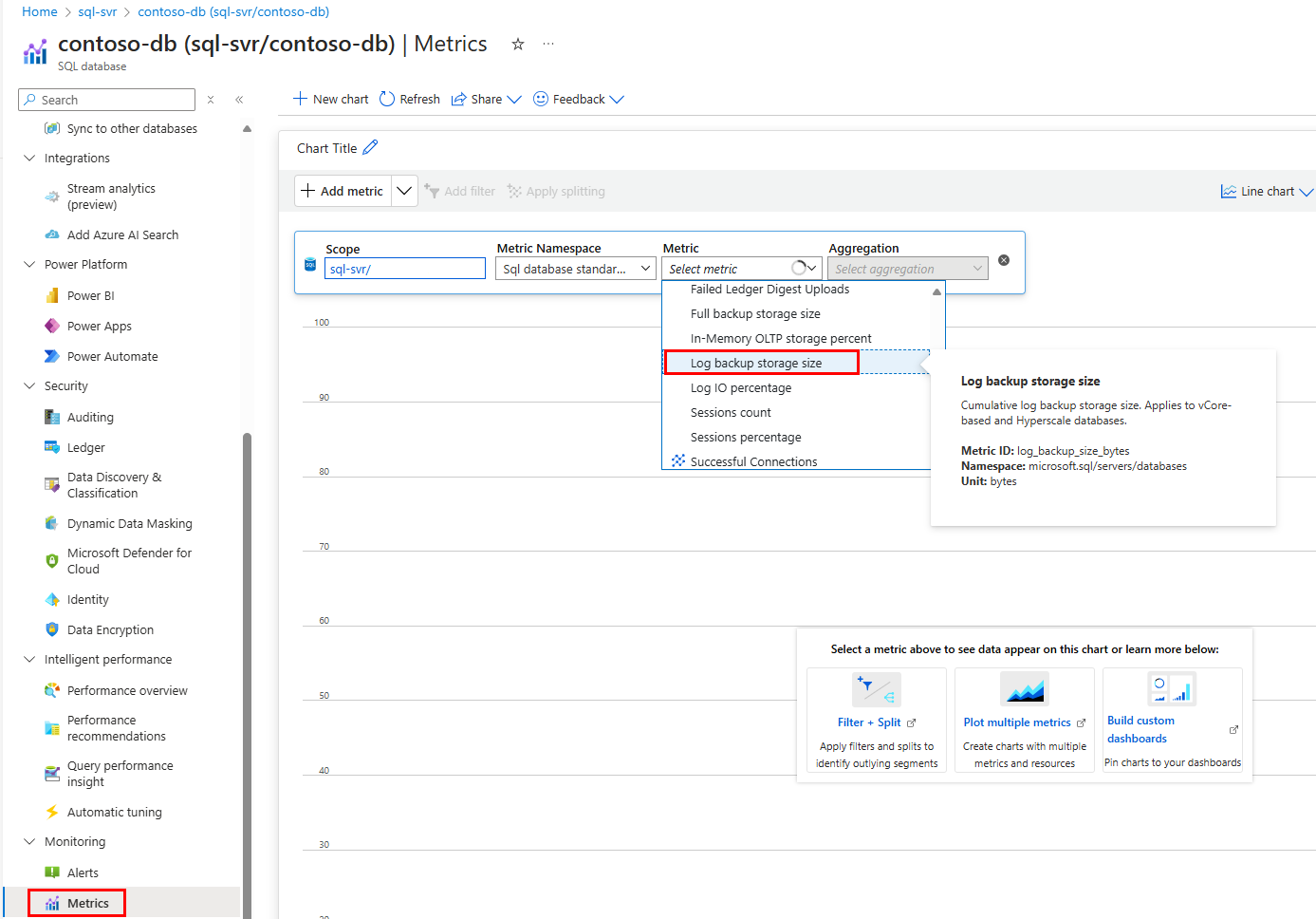 屏幕截图显示为在 Azure 门户中监视数据库备份消耗而做的选择。
